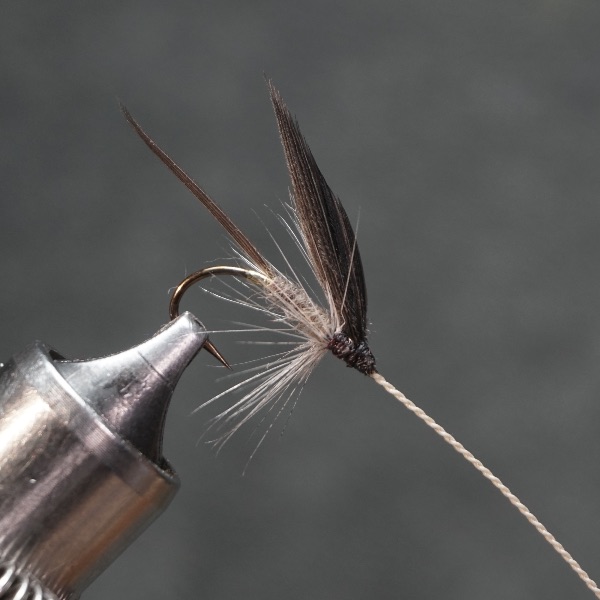 Materials: gold, dark dun barbs, gray dubbing, light blue dun soft rooster, dark dun quill slips