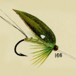 Materials: gold tinsel, gold tinsel, three dark feather barbs (Pheasant tail), green floss, green parrot breast or covert, green parrot quill slips