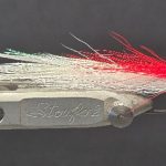 Materials: White Bucktail, Pearl Krystal Flash, 4 White Saddle Hackles, Large Silver Mylar Tinsel, White Bucktail, Red Bucktail