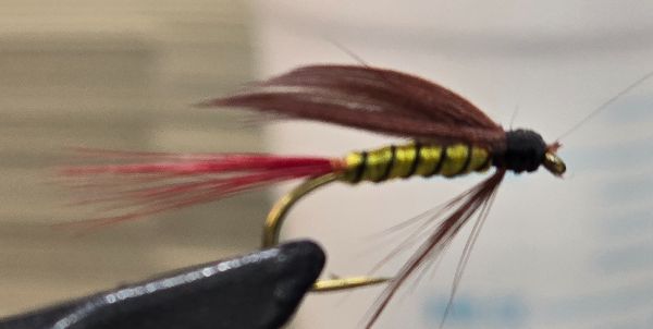 Shockley’s Wet Fly November 18, 2025 Published by DDOlson Shockley’s Wet Fly Wet Fly Tied By Darrell Olson Hook: Standard Wet Fly Hook, Size 8 Thread: 140 Denier – Black Tail: Red Hackle FibersRib: Black Sewing ThreadBody: Yellow FlossThroat: Brown Hackle FibersWing: Brown Turkey Slips Notes: Print 🖨 PDF 📄
